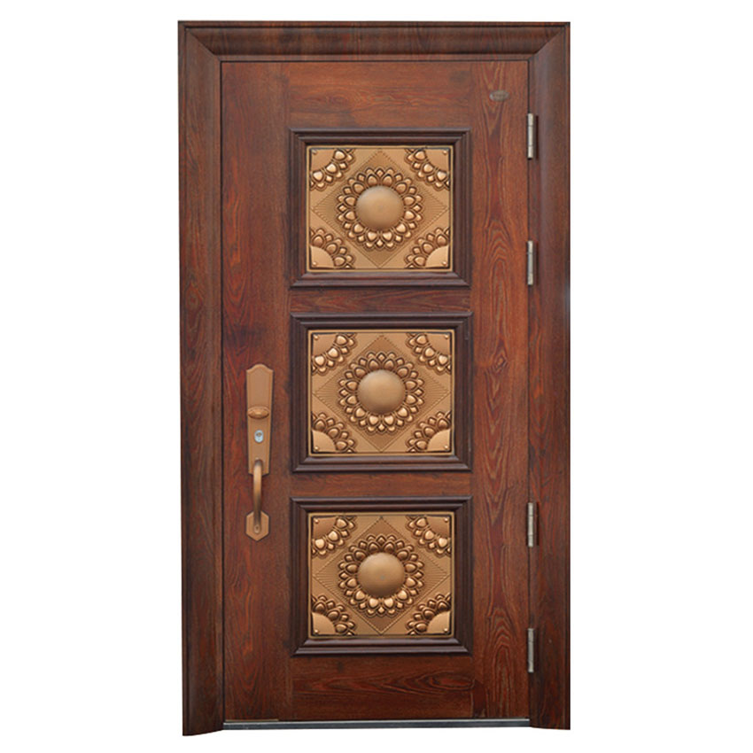 產品介紹:一摒普通鋼制防盜門冰冷而且造型單一的感覺,拼接門加入了時尚、高貴的色彩和造型