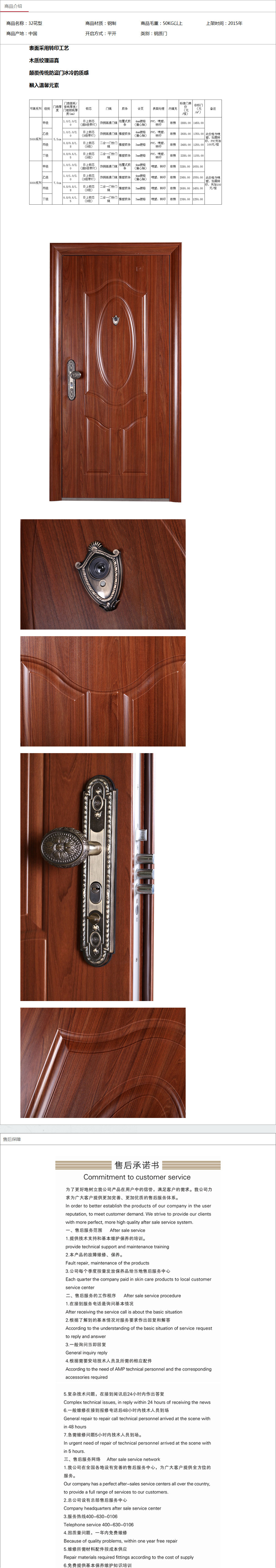 產(chǎn)品介紹:表面采用轉(zhuǎn)印工藝 木質(zhì)紋理逼真 顛覆傳統(tǒng)防盜門冰冷的質(zhì)感 融入溫馨元素